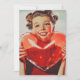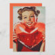 Image nostalgique des années 1950 d'une jeune femme souriante tenant un objet lumineux, creux et en forme de coeur. Sa tenue rouge vibrante et son expression joyeuse évoquent la chaleur, la joie et l'amour intemporel, capturant le charme vintage de l'époque.