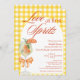 Rustique Elégant Cute Chic Love At First Spritz Bridal Shower Invitation - Doté d'une aquarelle Aperol spritz avec une garniture en tranche orange, ornée d'un arc orange coquette. L'invitation a un arrière - plan jaune en vichy rustique et un cadre en arc blanc. Les mots "Love at first Spritz" sont écrits dans un mélange de calligraphie de script raffiné et élégant bloc de texte orange foncé brûlé. Modifiez ce modèle d'invitation de douche nuptiale avec vos propres détails d'événement. Également disponible en téléchargement numérique instantané, facilement envoyer par texte, email ou médias sociaux.