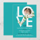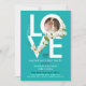 Cette invitation moderne à une fête de la Saint-Valentin comporte un grand script blanc gras disant Amour, une photo de couple à l'intérieur de l'une des lettres, et quelques ornements floraux blancs, le tout sur un fond turquoise élégant. Le dos est turquoise. Il peut également être personnalisé pour être utilisé pour un anniversaire de mariage, pour un anniversaire, pour la fête des mères, pour Pâques ou une autre occasion festive. Il est disponible à la fois en format imprimé et en téléchargement numérique.