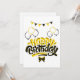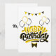 Cette invitation met en valeur les mots "Joyeux Anniversaire" dans une police d'écriture unique avec des lettres noires et jaunes ainsi qu'un contour inversé avec des ballons de fête d'anniversaire, des banderoles dans ce thème et style d'anniversaire. Imprimé sur un papier classique de 17,5 pt d'épaisseur avec une finition mate non couchée avec une texture de coquille d'œuf fabriqué et imprimé aux États-Unis avec "C'est une Fête" imprimé au verso.