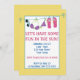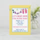 Cette invitation à la fête d'anniversaire de piscine comprend une paire de lunettes de soleil, un maillot de bain et des tongs accrochés à une ligne et des champs de texte personnalisables.