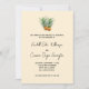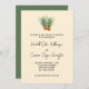 Faire-part de mariage minimaliste aux ananas. Couleur jaune-orange pâle avec script moderne et polices imprimées, cette invitation offre des mises à niveau papier et aussi une option de téléchargement. Deux petits ananas sont le design en haut, avec des modèles en écriture manuscrite pour les noms du couple. Reverse est vert foncé solide.