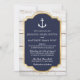 Un faire-part de mariage à thème nautique accrocheur, avec une icône d'ancrage, cadre faux doré et arrière - plan de bois rustique.