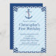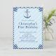 Commencez votre fête d'anniversaire nautique à droite avec notre invitation moderne à l'anniversaire de la navigation de plaisance avec un ancre rouge et bleu marine sur un arrière - plan bleu clair avec une bordure en zigzag de chevron bleu. Mignonne pour une première fête d'anniversaire pour filles ou pour les premiers garçons. Visitez notre boutique pour voir d'autres invitations nautiques à la fête d'anniversaire de la voile et des notes de remerciements assorties, autocollants et timbres-poste. © Designs Blackleaf