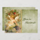 Invitations personnalisées à l'ange de Noël - design Vintage et classique de l'ange de Noël - Un ange blonde aux cheveux frisés est enveloppé d'un tissu doré fragile. Elle est entourée de fleurs violettes et bleues et au-dessus d'elle sont des baies saintes et des feuilles. Derrière le vieux cerub est une étoile d'or. "You're Invited" est imprimé en lettres vertes assorties sur le devant de ces invitations ou annonces d'anges religieux, avec coordination de l'ancien arrière - plan de papier vert et de la parties scintillant d'or scintillant à l'air. Entrez votre propre texte customisé de l'autre côté avec des lettres vertes assorties et un vieux papier ancien. Modifiez la couleur de texte personnalisée, le style de police ou le libellé si vous le souhaitez. Le libellé actuel est celui d'une invitation à la fête de Noël.