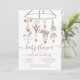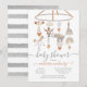 Cartes d'invitation Baby Shower Cirque modernes et mignonnes. Belle ambiance scandinave avec un éléphant, un homme fort, un maître de piste, un cheval, un phoque, un arc-en-ciel, des nuages et des étoiles suspendus à un mobile. Palette de couleurs neutres pour un bébé garçon ou fille. Terre cuite, gris bleu poussiéreux et blanc.
