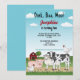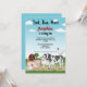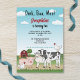 L'illustration de dessin animé originale de Destei mettant en vedette des animaux de ferme mignons, notamment une vache noire et blanche, un cochon rose, un mouton et deux poulets. Au dos, il y a une grange rouge sur des collines vertes herbeuses avec un arbre et du foin. Le ciel est bleu avec quelques nuages. L'un des poulets est perché sur la vache. Personnalisez les zones de texte d'exemple avec les détails de votre fête.