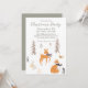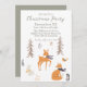 Cette invitation de fête mignonne présente un thème de forêt hivernale avec un design d'art folklorique scandinave. Divers animaux de la forêt sont représentés parmi les arbres dans une forêt hivernale. Un petit renard est en bas avec un oiseau au-dessus. Un faon est placé au centre, et un petit lapin est à gauche. Des baies et du feuillage accentuent l'image. C'est parfait pour une baby shower hivernale, un anniversaire ou une fête de Noël.