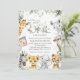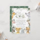Invitations amis et famille dans le style et donner le ton pour votre journée spéciale avec cette charmante invitation baby shower. Le design présente des animaux de la jungle (girafe, singe, zèbre, lion, éléphant, guépard, meerkat, rhinocéros) et des feuilles d'eucalyptus sur arrière - plan blanc.