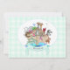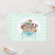 L'Arche de Noé pleine d'animaux avec une bannière aqua qui lit "Bébé en route !" sur un fond gingham vert menthe. Le revers est une cigogne portant un bouquet de menthe. Parfait pour Baby Shower, Annonce de naissance, Christening ou Baptême.