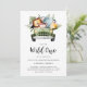 Personnalisez facilement cette invitation au thème d'animaux de safari pour bébé, garçon ou fille, élégamment stylisée pour votre baby shower. L'invitation présente des animaux de safari mignons : lion, singe, girafe et éléphant dans une voiture verte. Le fond est d'une couleur vert clair uni.