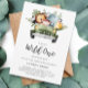 Personnalisez facilement cette invitation de thème animaux de safari wild one pour votre baby shower. L'invitation présente des animaux de safari mignons : lion, singe, girafe et éléphant dans une voiture verte. Le fond est vert clair uni.