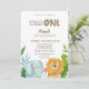 Cette première invitation d'anniversaire avec des animaux sauvages de couleur aquarelle, et des feuilles de palmiers.