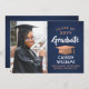 Annoncez un baccalauréat ou un collège de diplôme et la famille et les amis invitations à célébrer avec photo personnalisée bleu marine et couleur cuivre invitations fêtes. L'image et le libellé sont simples à personnaliser et les couleurs sont faciles à changer avec l'outil de design Zazzle. Ce modèle téléchargeable est configuré comme une carte de faire-part combinée et une invitation à la fête qui peut être customisée avec tous les détails de votre choix, tels que les noms des parents, les distinctions spéciales, le titre du diplôme, la citation inspirante préférée, les plans futurs du diplômé ou nouvelle adresse. Le design est composé d'un arrière - plan bleu marine, d'un casquette de planche de mortier en faux cuivre, d'une élégante calligraphie moderne, d'une typographie vintage classique et d'une photo préférée, telle qu'une photo de haut niveau ou une image de la cérémonie de début. Veuillez noter que le cuivre est de couleur orange muet et non métallique. Cette carte de graduation imprimable est une façon élégante d'annoncer une fête spéciale. Félicitations au diplômé !