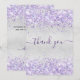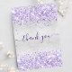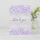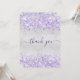 Un carte de remerciements d'anniversaire féminin et élégant. Une fausse couleur arrière - plan à l'aspect argent. Avec une parties scintillant violette et violette, pétille. Sur l'avant grand main écriture et le texte : Merci. Retour : Personnalisez et ajoutez Votre note de remerciement et votre nom. Le nom est écrit avec un script de style moderne écrit à la main avec des swashes.