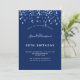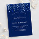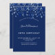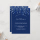 Une invitation moderne, élégante et raffinée. Un arrière - plan bleu marine décoré de confettis bleus. Personnalisez et ajoutez un nom et des détails. Texte blanc.