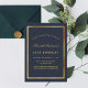 Un arrière - plan bleu foncé, un décoré d'un faux cadre doré. Personnalisez et ajoutez un nom et des détails du parti. Le nom est écrit avec un élégant script de style écrit à la main. Retour : arrière - plan bleu.