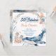 Profitez d'une fête sur le thème de la plage de 50 ans et fabuleuse à la maison ou partez en voyage au bord de l'océan. Un design de script moderne et amusant avec de beaux bleus et sarcelles. Comprend une belle baleine aquarelle, des coraux et du sable. Joyeux Anniversaire ! Cet article fait partie d'une collection.