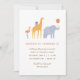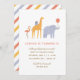 Appelle tous les animaux de fête ! Célébrez l'anniversaire de votre petit avec cette invitation colorée, avec un flamant, une girafe et un éléphant en fête et un motif à rayures audacieux sur le dos.