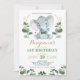 Impressionnez vos invités avec cette mignonne invitation d'anniversaire. Il présente l'illustration d'un adorable éléphant de bébé, une verdure élégante d'aquarelle en vert tendre et or accompagné d'un lettrage élégant. Il est accompagné d'un motif de feuille correspondant sur le dos. Utilisez les champs modèles pour ajouter vos détails. Si vous souhaitez modifier le style de police, la couleur ou le placement de texte, cliquez simplement sur le bouton "Customiser plus loin".