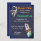 Cette invitation personnalisée présente un thème spatial. Une image d'un astronaute est photographiée en haut à gauche. La planète Terre est vue de loin avec un vaisseau-fusée qui s'en éloigne. L'arrière - plan est d'un bleu foncé avec des étoiles faibles et une bordure de galaxie motif.