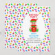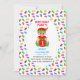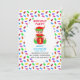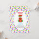 Elfe mignon tenant une boîte cadeau et des friandises d'ours multicolores Invitation pour le premier anniversaire de bébé. Textes et numéros prêts à être personnalisés pour tous les âges des enfants !