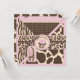 Les posters de animaux bruns et crèmes de safari sauvage de patchwork avec l'arc 3D-look et les équilibres avec l'étiquette de nom de girafe et le cercle de petit gâteau étiquettent le sixième design de carte d'invitation d'anniversaire.