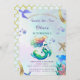 Sirène pourpre sous la mer avec la mer Créatures. "Rejoignez la fête sous-marine avec cette merveilleuse invitation d'anniversaire aux sirènes violettes et dorées. Une magnifique queue de sirène et une scène de mer capricieuse, ce qui en fait un endroit idéal pour toute petite journée spéciale de sirène.