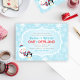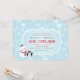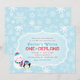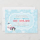 Invitation de fête pour le premier anniversaire de "ONEderland" sur le thème de l'hiver avec un bonhomme de neige joyeux et un manchot arctique mignon avec le numéro un (1) sur son ventre, dans un cadre décoratif et un fond orné de flocons de neige. Couleurs bleu glace, turquoise, rouge et blanc.