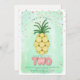 Thème d’anniversaire Luau Deux-Tti Fruitti avec illustration de sculptures d’ananas et de ballons "Deux" avec arrière - plan bleu et confetti rose inspirés de l’aquarelle.