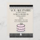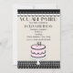 Une invitation à la fête d'anniversaire avec des couleurs claires rose, noir et blanc. arrière - plan beige et papier métallique au champagne. Illustration d'un gâteau d'anniversaire rose et noir au fond assis sur un stand de gâteau blanc et d'un blanc avec nappe à point de polka noir. Le dessus est recouvert de coquillage noir et blanc. Le texte est noir. Personnalisez-vous avec les détails de votre occasion et l'âge sur gâteau.