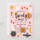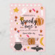 Carte d'invitation à la fête d'anniversaire de la fille à thème halloween mignonne avec illustration d'un fantôme, chat noir, araignée, chauve-souris, bonbons et citrouilles. Le texte dit "Éffrayant".