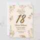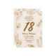 Un design élégant de carte d'invitation célébrant un 18ème anniversaire. L'arrière - plan est décoré dans un ton beige chaleureux avec des éléments délicats, comme des fleurs, des papillons et des plantes illustrés de fines lignes dorées