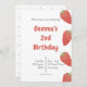 Invitation d'anniversaire au thème de la fraise. Lettres lumineuses avec des fraises. Détail de pois sucrés au verso. Rouge et rose. Parfait pour le deuxième anniversaire d'un bébé ou d'un tout-petit, le premier anniversaire, la baby shower, la future maman, la douche de mariée, la fête de cuisine, la fête des 30 ans. Modifiez facilement le texte moderne et amusant. S'intègre parfaitement dans un thème de fête tutti fruity / twotii fruity ou un thème très sucré. Trouvez des accessoires assortis dans la boutique Gemma Harlow Creations ou transférez le design sur vos produits préférés.