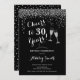 Invitation du 30e anniversaire. Salutations À 30 Ans ! Design élégant en noir, blanc et faux argent parties scintillant. Il comprend des verres à champagne, des caractères de script et des confettis. Parfait pour une soirée de trentième anniversaire. Personnalisez avec vos propres détails. Peut être customisé pour montrer n'importe quel âge.