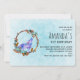 Une invitation d'anniversaire dans un style bohème amérindien. Conçue avec une illustration graphique composée d'un loup aquarelle violet, dans une pose classique de hurlement. Entouré d'une couronne illustrée de bois, cristaux, plumes et perles.