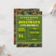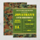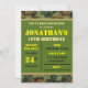 Invitez vos amis à se joindre à vos célébrations d'anniversaire avec ces invitations de fête de style militaire amusantes. Au dos et en haut et en bas de l'avant, il y a un motif de camouflage dans des tons marron et verts. Le lettrage est placé sur un fond vert en texte jaune, noir et beige. Tout le texte principal a été transformé en modèles pour faciliter l'ajout de vos propres détails.