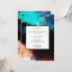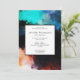 Une invitation de fête d'anniversaire au look artistique moderne. Conçue avec un design abstrait créatif. Taches de peinture et couleurs tourbillonnantes en turquoise, blanc, orange et noir avec des touches de bleu.