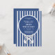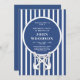 Une invitation à une fête d'anniversaire nautique bleu marine pour un homme avec une ancre et un fond rayé bleu marine et blanc. Parfait pour une fête d'anniversaire de bateau !