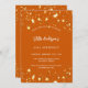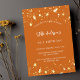 Un arrière - plan orange brûlé décoré d'étoiles dorées. Personnalisez et ajoutez un nom et des détails du parti. Le nom est écrit avec un script de style écrit à la main, des lettres de couleur blanche.