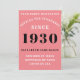 Pour ceux qui sont nés en 1930 et fêtent leur fête d'anniversaire, nous avons la carte d'invitation idéale. L'arrière - plan rose aux motifs blancs et noirs est simple et élégant. Customisez facilement le texte à l'avant et à l'arrière de cette carte d'invitation d'anniversaire en utilisant le modèle fourni. Une partie de la gamme de normes d'établissement de cartes, de fournitures de fête et de cadeaux.