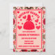 Une carte de jeu rétro inspiré Queen of Hearts Roses et Alice dans le thème de fête d'anniversaire au pays des merveilles conception d'invitation dans une palette de couleurs rouge et rose brillant avec roses et détails de coeur.
