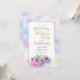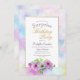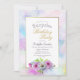 Une invitation à la fête d'anniversaire florale bleue et rose avec une bordure d'aquarelle peinte d'or et de pastel.