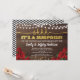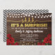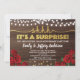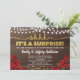 Élégante invitation surprise rose rouge et or avec guirlande lumineuse sur fond de bois rustique. Élégant, féminin et glamour.