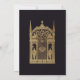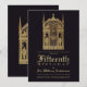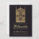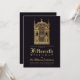 Cette invitation vintage noire et or pour une fête d'anniversaire sur le thème médiéval comporte dans la partie supérieure une porte de château fort médiéval entre deux tours gothiques, gardée par deux chevaliers en armure, avec des hallebardes. Au-dessus d'eux, il y a deux autres chevaliers en armure, chevauchant à cheval, portant des drapeaux, et au centre, au-dessus de la porte, il y a un lion héraldique. Le texte est écrit en lettres dorées sous l'illustration. Le nom et l'âge sont écrits avec des polices gothiques de style médiéval. Le fond est noir.