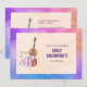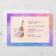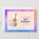 Une invitation de fête d'anniversaire avec un design féminin. Illustré avec une image aquarelle d'un violon en bois, des chaussons de ballet roses posés contre et décorés de fleurs et de papillons. Sur un fond aquarelle multicolore.