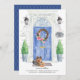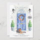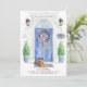 Annoncez votre nouvelle adresse avec notre annonce élégante mettant en vedette un Yorkshire Terrier, une porte d'entrée bleue, un paillasson, un panneau d'ardoise, des topiaires et une couronne de fleurs sur un fond de briques grises.