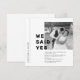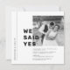 Cette carte moderne en noir et blanc est idéale pour annoncer votre mariage. Elle comporte la mention 'Nous avons dit Oui', les noms des jeunes mariés, l'annonce de leur fuite en amoureux et l'invitation à la fête post-mariage. Le modèle est entièrement modifiable, il suffit d'ajouter votre photo de couple et de remplacer le texte.