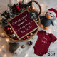 Ce flat lay présente un charmant manchot de Noël au crochet, un panier festif rempli de décorations de Noël et de verdure, et un body bébé rouge avec un espace pour personnaliser le nom de votre bébé. Niché à l'intérieur du panier se trouve un tableau à lettres classique affichant votre message spécial. Que vous partagiez votre nouvelle sur les réseaux sociaux, imprimiez une carte souvenir, ou ajoutiez un moment spécial à l'album de bébé, ce design de vacances neutre en termes de sexe est une façon joyeuse de célébrer la saison et votre famille grandissante.