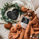 Célébrez votre nouvelle excitante de la manière la plus confortable avec ce design d'annonce de grossesse sur le thème de l'automne ! Parfait pour les révélations sur les réseaux sociaux, les annonces de bébé ou les souvenirs, cette mise en page présente un ours en peluche douillet enveloppé dans une couverture d'automne douce, tenant avec amour un cadre en bois rustique avec votre image d'échographie au centre.